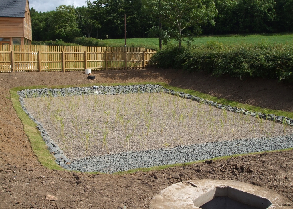The system is installed either side of a watercourse which divides the site. The septic tanks and reedbed (horizontal flow type) provide for passive treatment of the sewage and are all landscaped into the communal amenity areas of the development. The reedbed also provides habitat for birds, amphibians and insects. The system is designed to meet good effluent quality standards and safely disperse treated sewage water into the adjacent watercourse.